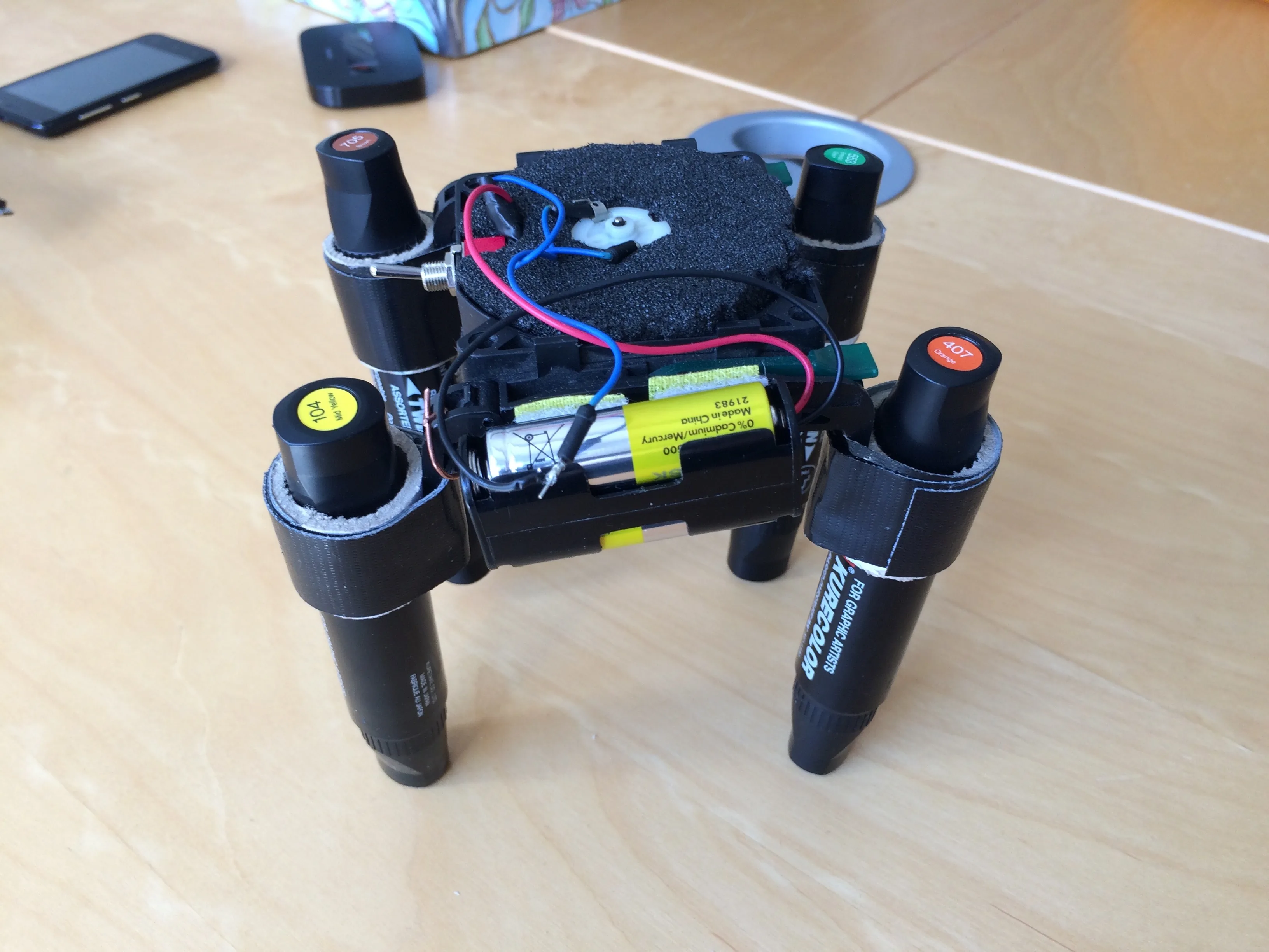 Our focus was evaluating what materials and construction techniques are appropriate for different age groups and skill levels. We also analysed how much of the building activity can be handled by the learners themselves as opposed to a very hands on coordinator involvement. Engineering choices such as the types of adhesives, pens, movement actuators and structural pieces can have a significant impact on the speed of progress which can be achieved.