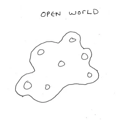 In an open world narrative structure, the protagonist doesn’t have any linear path at all and can choose any aspect of the plot in any order at any time. In this structure, the story needs to be devised to work in a way that it can be discovered in any order. This is a very good model to explore more experimental approaches to storytelling through in-game assets, discussions between protagonists and other non player characters or even emergent storytelling where the game itself rewrites the story depending on the chosen actions of the protagonist.