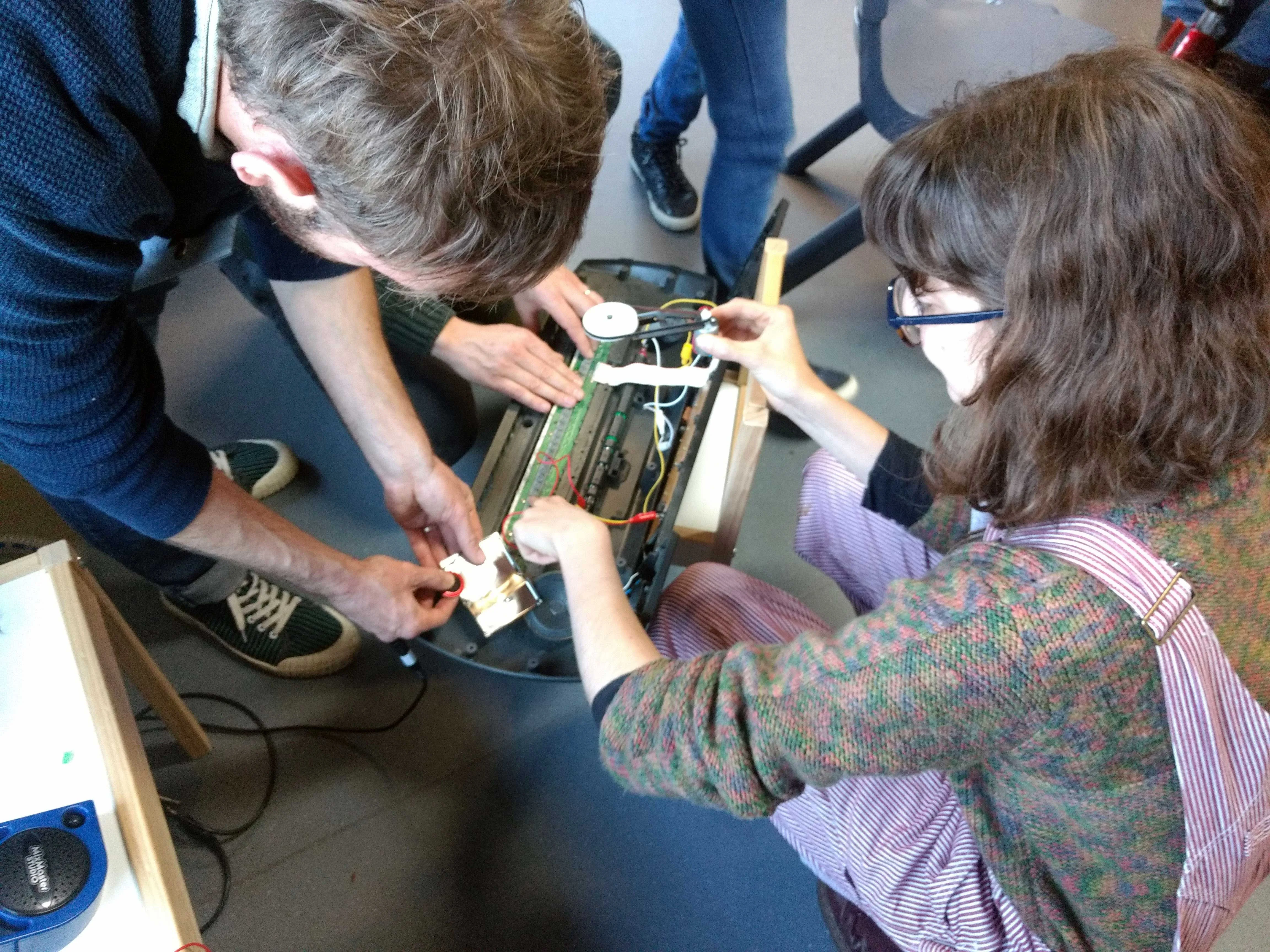At the same time Malcolm and Alice were trying to “circuit-bend” a partially dismantled keyboard. I had also brought some contact piezo microphones with me as I wanted to create something I had previously seen working well at the Exploratorium. At a certain point we tried to bring the microphone to the circuit-bent keyboard to try and amplify the sound of the speaker but it soon became clear that it was much more fun to amplify a motor that one of the children had been hooking up.