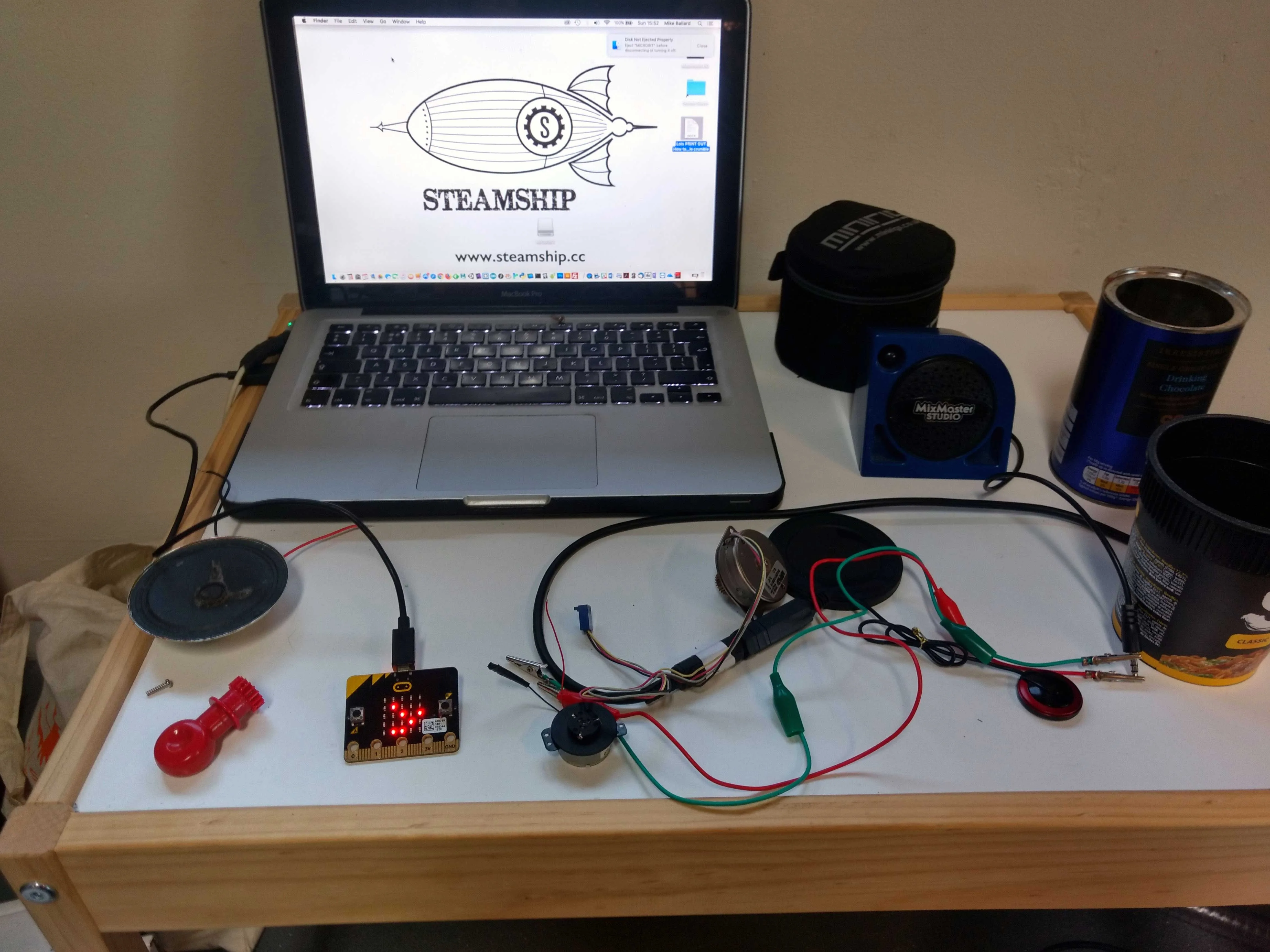 When we were asked to work with Mufti Games, a Bristol-based organisation which creates playful and memorable experiences for all ages, naturally we jumped at the chance. There is overwhelming evidence of the importance of play in learning, you only have to look at the work of Semour Papert and Mitch Resnik and ultimately their involement in the development of the Lifelong Kindergarten at MIT to see how play is central to understanding the nature of play. As we shared a common goal to help people feel more comfortable about inventing through play, it seemed that a workshop where both the STEAMShip and Mufti Games could share ideas about how to get young people involved in tinkering and constructing, was a fitting way to work together.